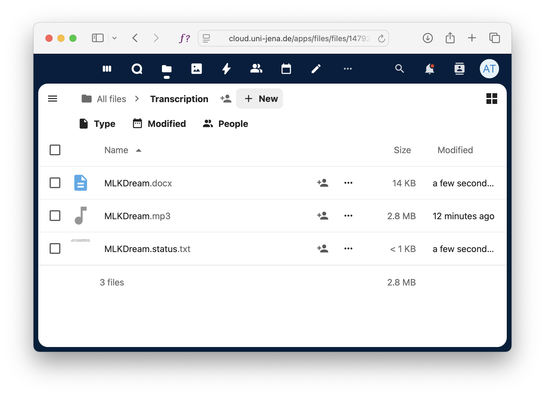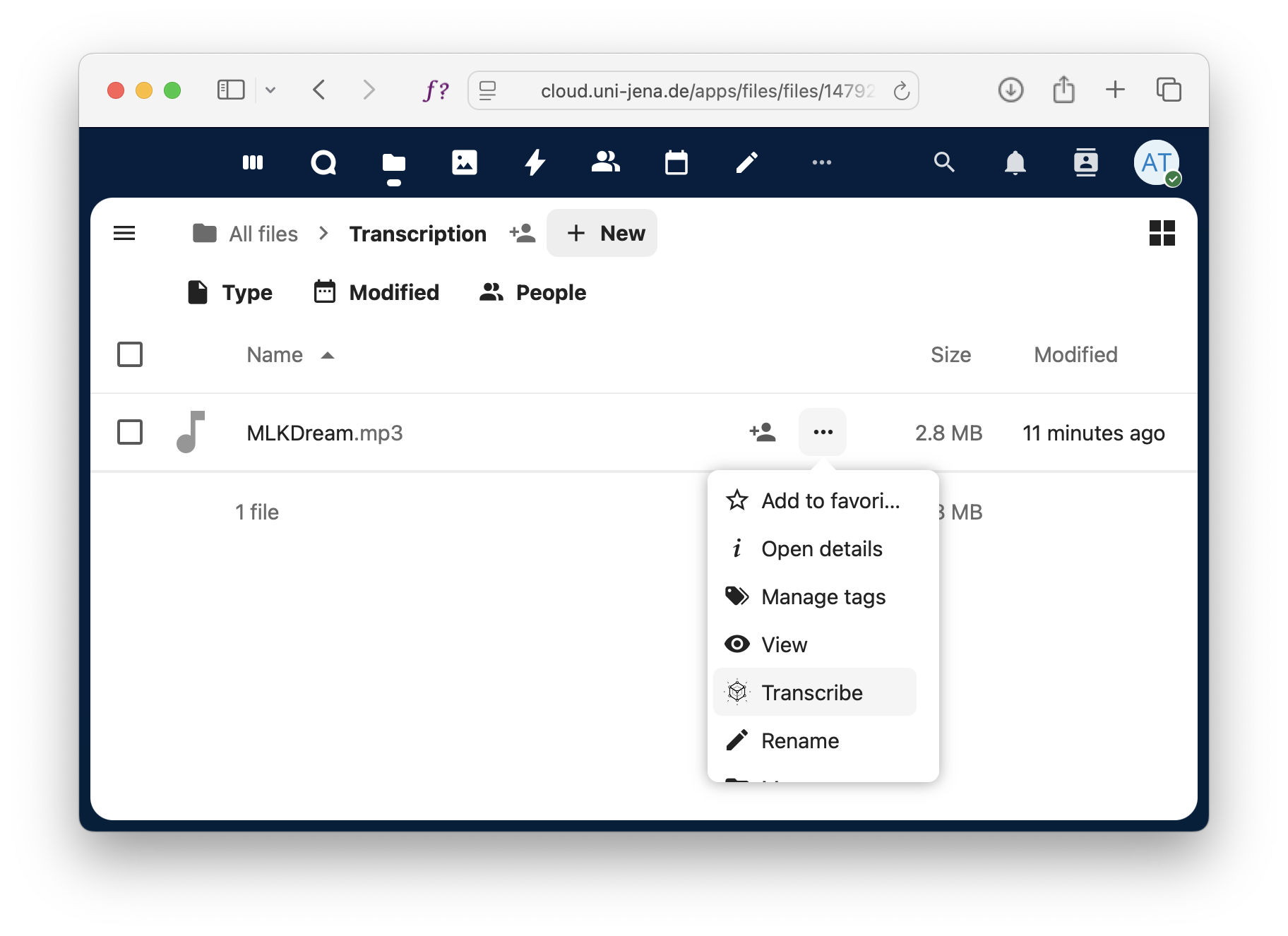 To use the service, log in to the university cloud at cloud.uni-jena.de with your URZ account. You can transcribe audio recordings that you upload there with a click in the context menu of each audio file. After a short time, the corresponding transcript will appear next to the recording as a Word document.